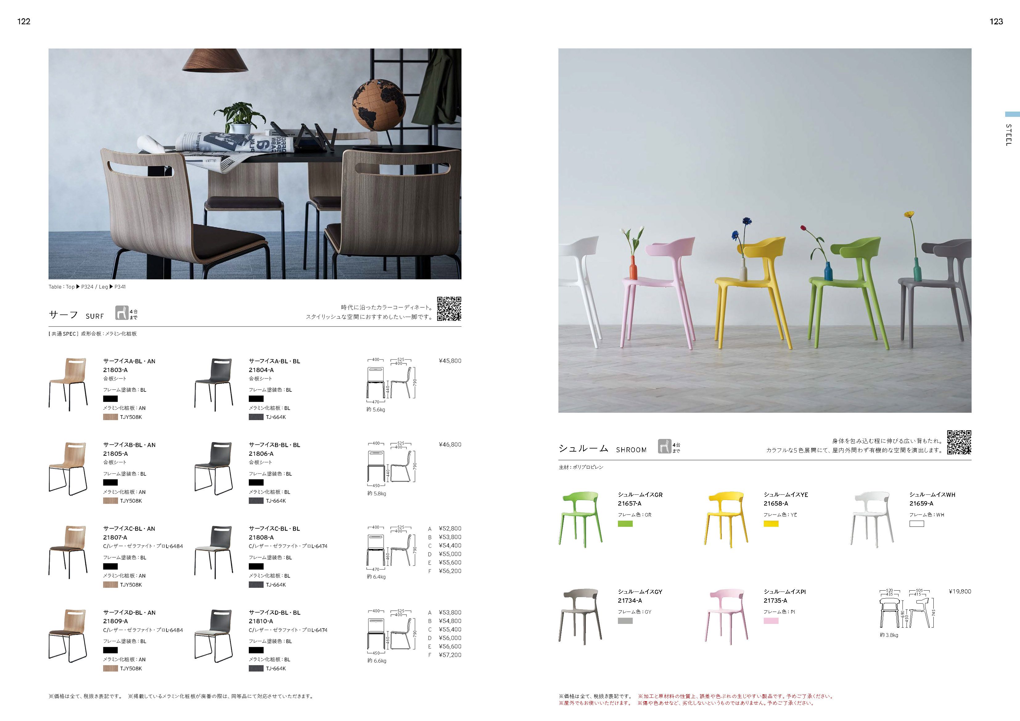 クリックで拡大します 商品名 サーフ A _ サイズW470×D525×H790(SH440) 仕様・数量を選択仕様または数量を選択してください。 塗装色 塗装色選択→ 変更 クリックして選択 円(税込) - オプション選択→ クリックして選択 - 内容 再選択 円(税込) 数量 価格 0円(税込) 戻る 【塗装色】を選択してください NA BL 閉じる オプションをつける場合は、選択してください プラパートE(セイオン)4個セット サイズ:「24.6φ×10(19.1φ用)」、「 21.4φ×10(15.9φ用)」 底部:フェルト 適床材:フローリング 脚部の摩耗防止・床面の保護 プラパートは、床材により摩耗します。床材の仕様を考慮の上、お選びください。 820円 プラパートF(フェルト)4個セット サイズ:「19.1φ×9」、「15.9φ×10」 底部:フェルト 適床材:フローリング 脚部の摩耗防止・床面の保護 プラパートは、床材により摩耗します。床材の仕様を考慮の上、お選びください。 590円 プラパートG(タフネス)4個セット サイズ:「19.1φ×6.5」、「15.9φ×6.5」 適床材:硬質タイル 脚部の摩耗防止・床面の保護 プラパートは、床材により摩耗します。床材の仕様を考慮の上、お選びください。 470円 閉じる カタログ掲載ページ カタログとホームページ掲載内容に(価格以外の)差異がある場合は、カタログを優先します